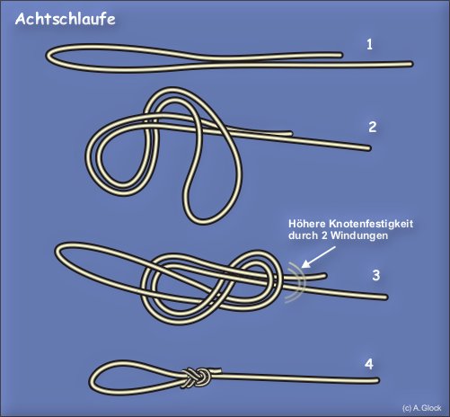 „Achtschlaufe mehrfach gedreht“), wobei sich auch die Knotenfestigkeit