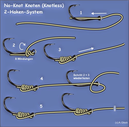 Haken mit dem gleichen Knoten an das Vorfach gebunden. Dabei kann das