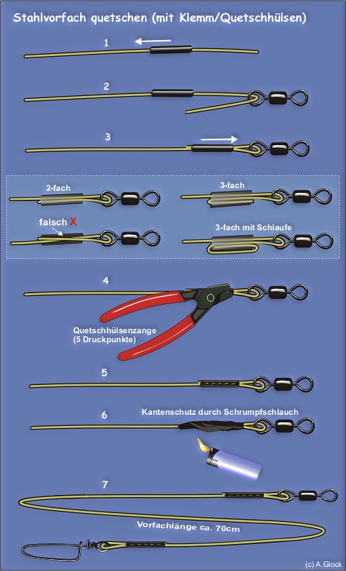 Vorfachmaterial reicht das 2-fache Durchziehen aus. Dünnes Stahlvorfachmaterial